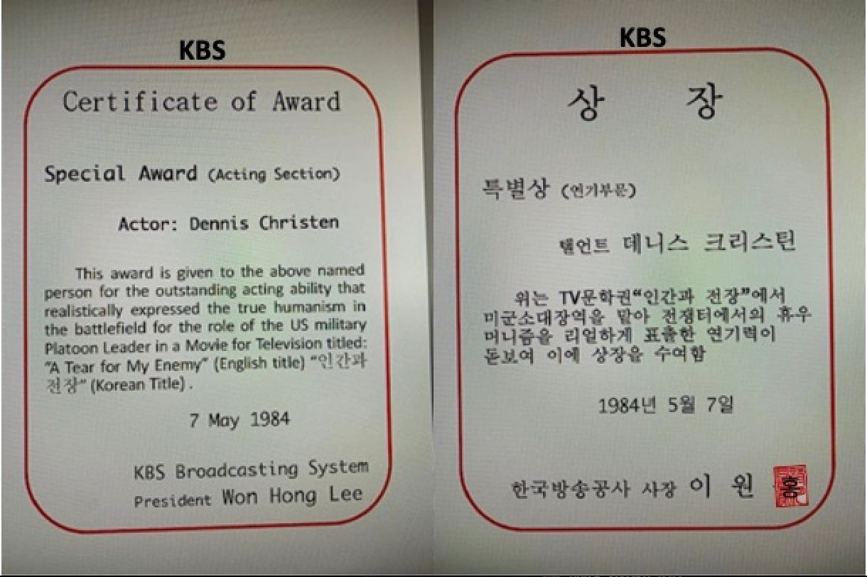 A TEAR FOR MY ENEMY/인간과 전장 KBS President, Won Hong Lee (이원홍) presents Dennis Christen with a Special Acting Award on 7th of May 1984. The first foreign actor to receive such award.
